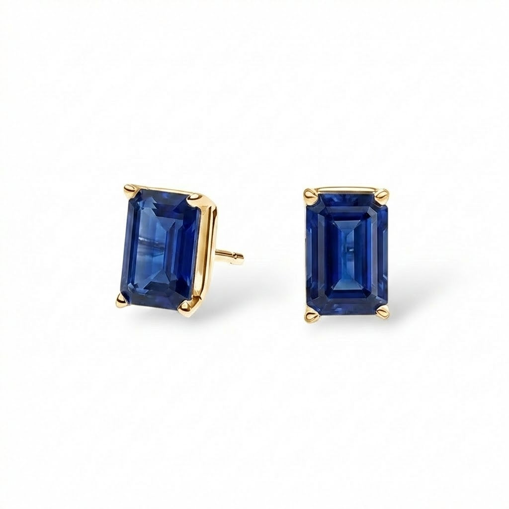 The emerald-cut sapphire, with its clean lines, elegant facets, and rich blue shade, creates a refined and timeless look. The prong setting allows light to enter from every angle, enhancing the stone’s natural glow. These stud earrings offer a perfect balance of understated luxury and modern elegance.
